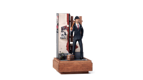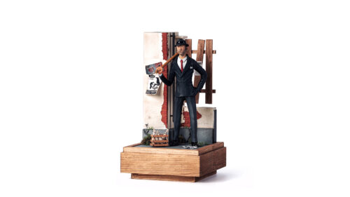 Diorama na téma herní série Mafia. Ručně modelovaná a barvená figurka klasického gangstera s baseballovou pálkou z polymerové modelovací hmoty, prodávajícího alkohol v době prohibice, zasazená do prostředí italské čtvrti třicátých let dvacátého století města Lost Heaven.