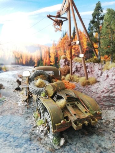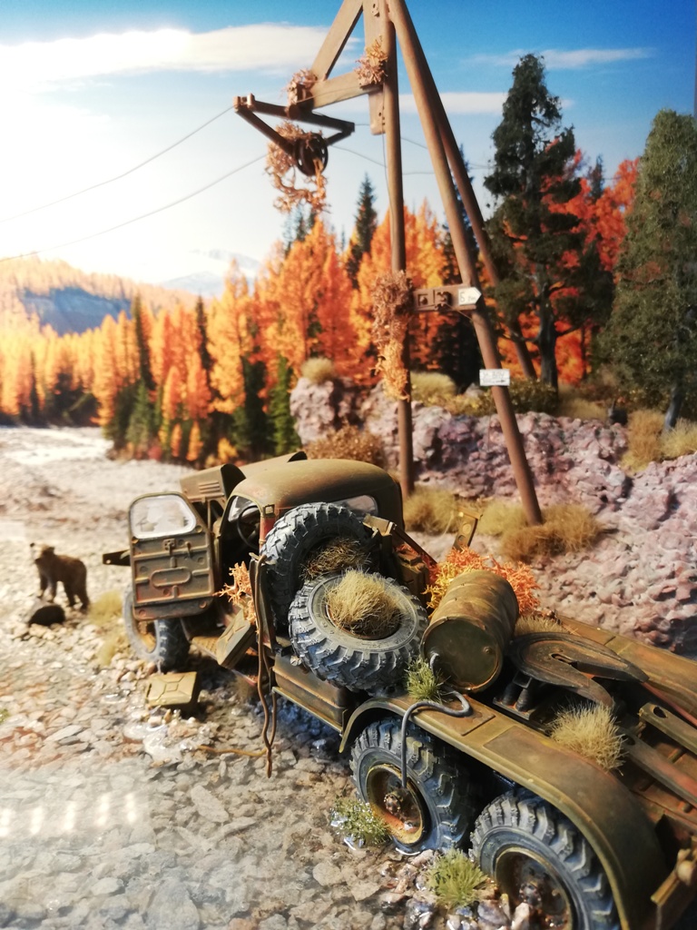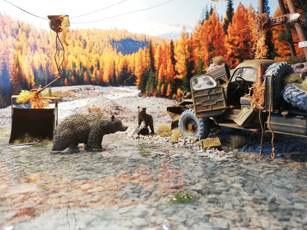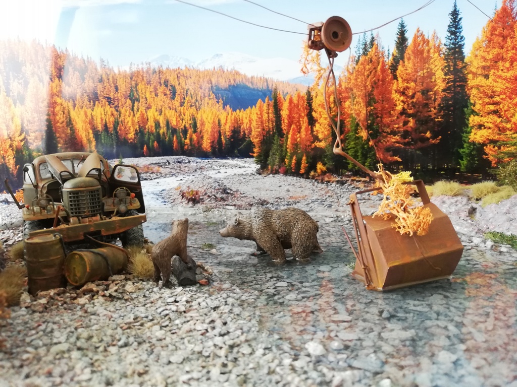 Diorama v měřítku 1:35 zachycující opuštěný tahač ZIL-157, hornickou lanovku a medvědici s mládětem v korytě divoké řeky protékající podzimní přírodou v oblasti Altaj.