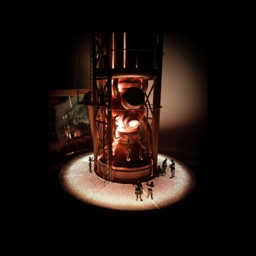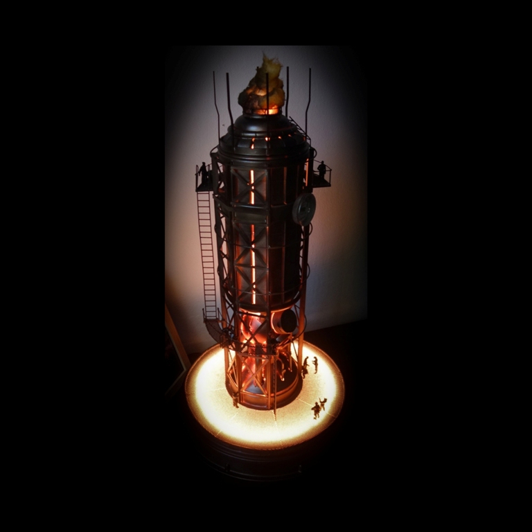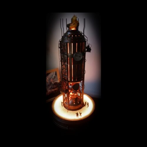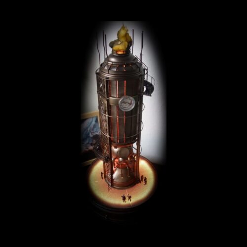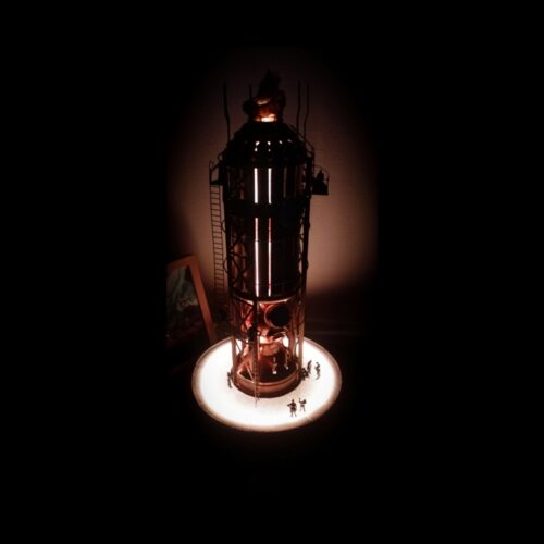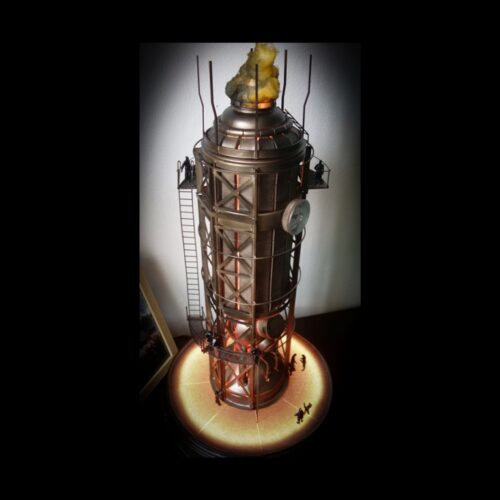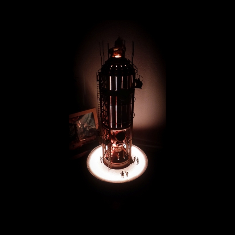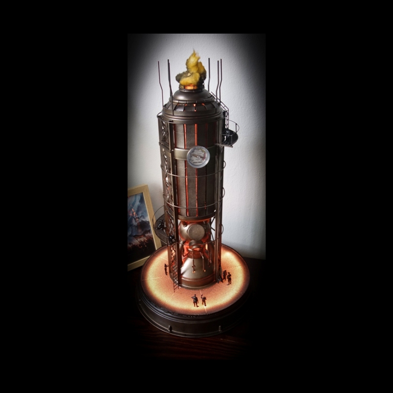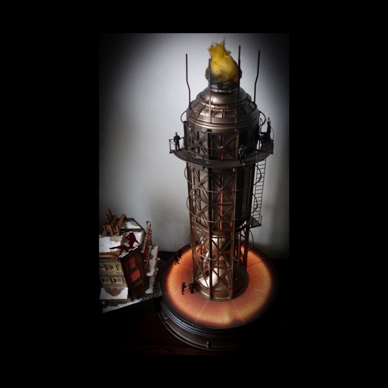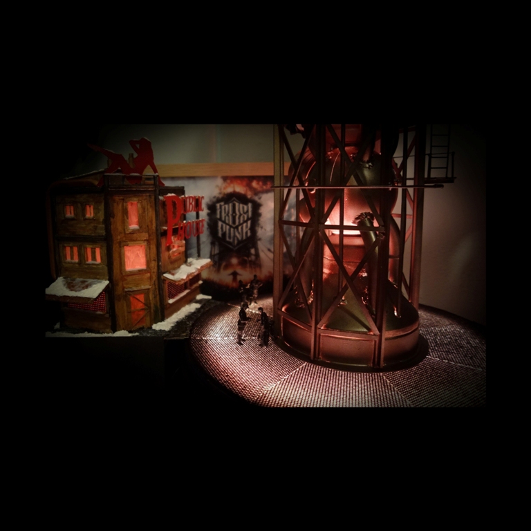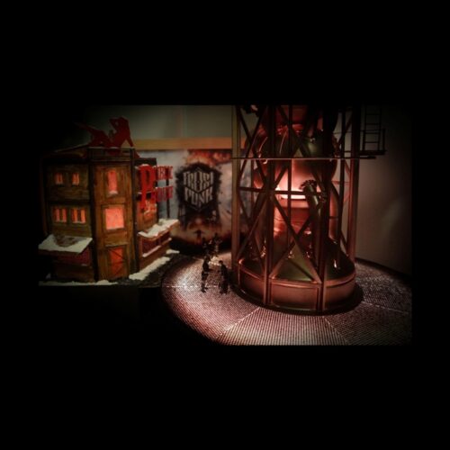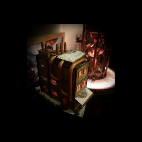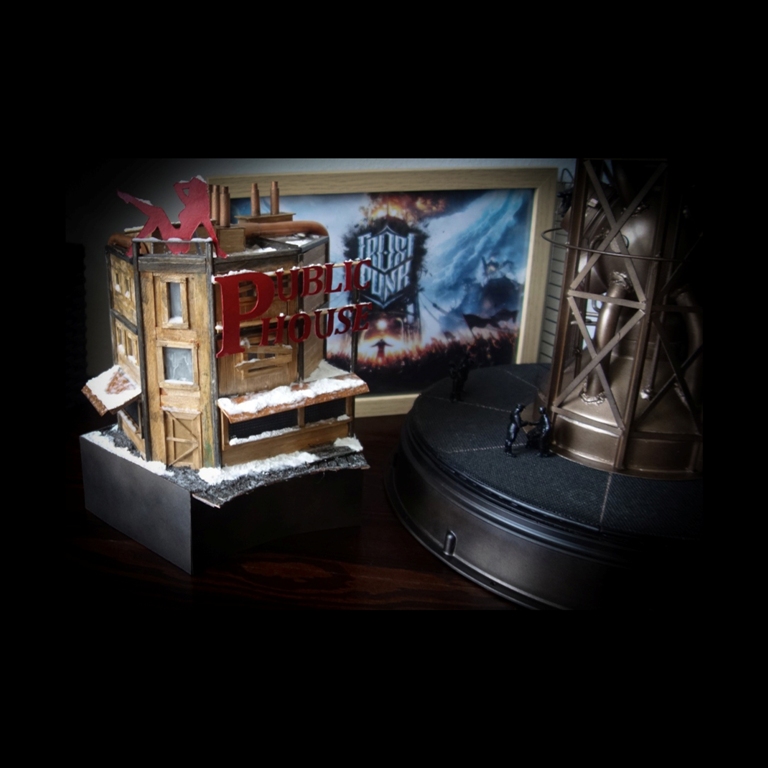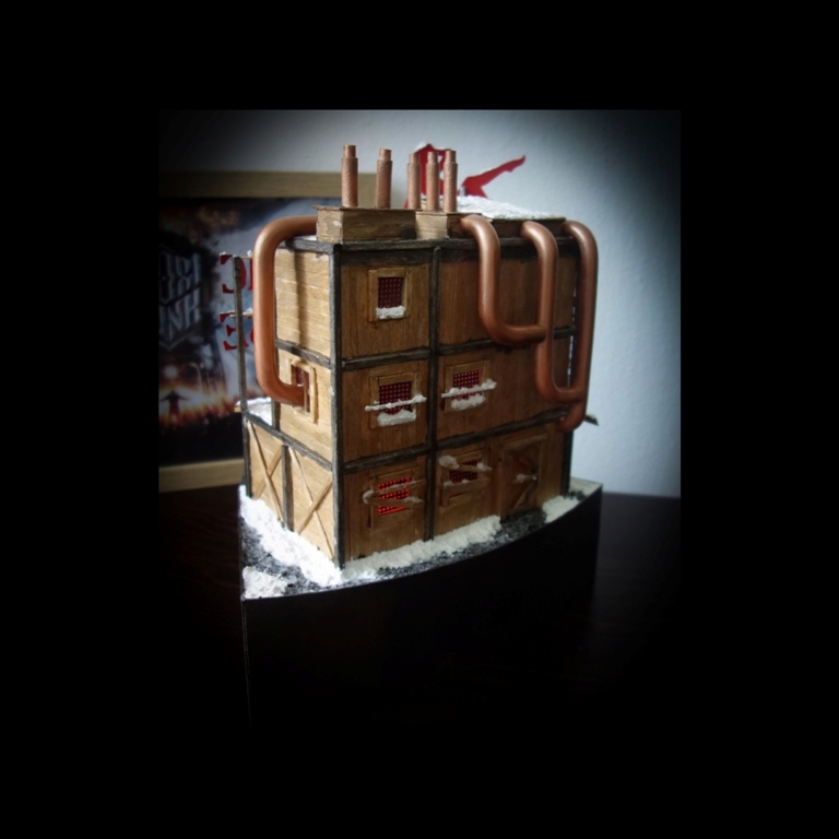 Dioráma inspirující se herním světem Frostpunku v měřítku 1:72 zobrazující tepelný generátor a veřejný dům.