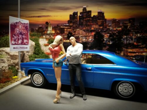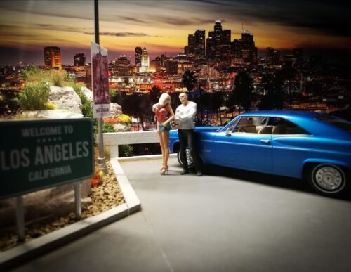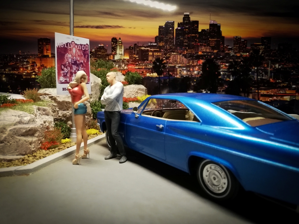 Diorama v měřítku 1:24 zachycující Chevrolet Impala model 1966 při západu slunce nad Los Angeles.
