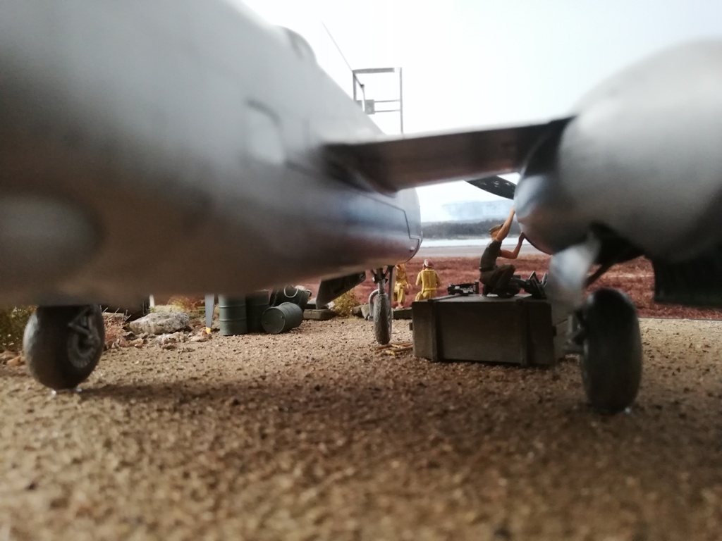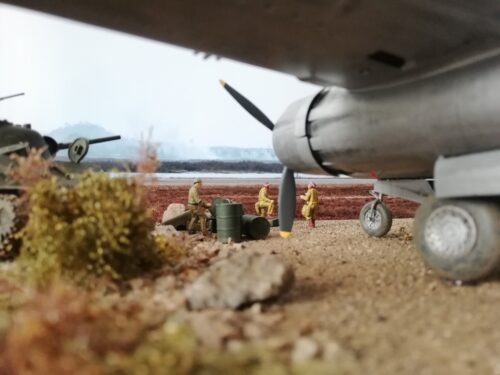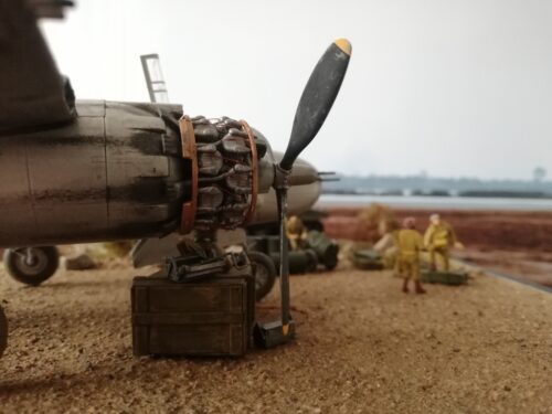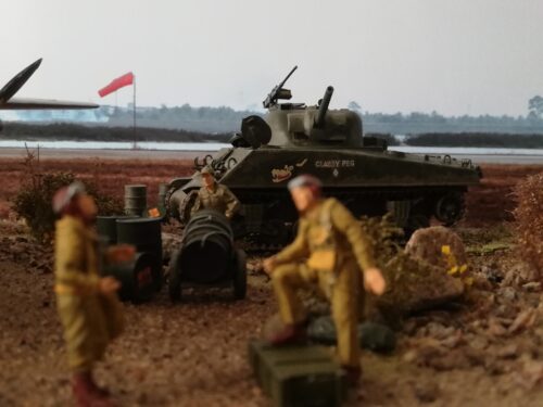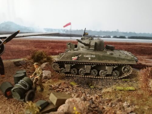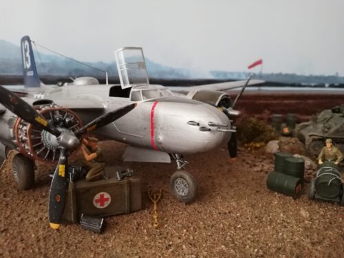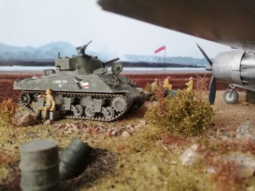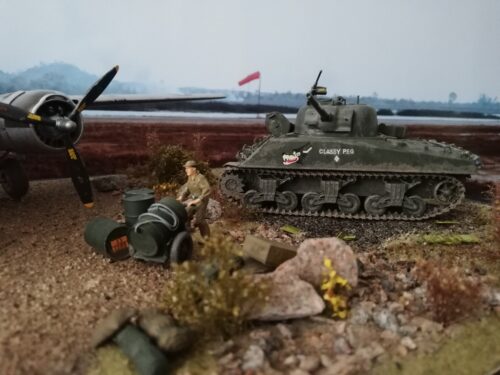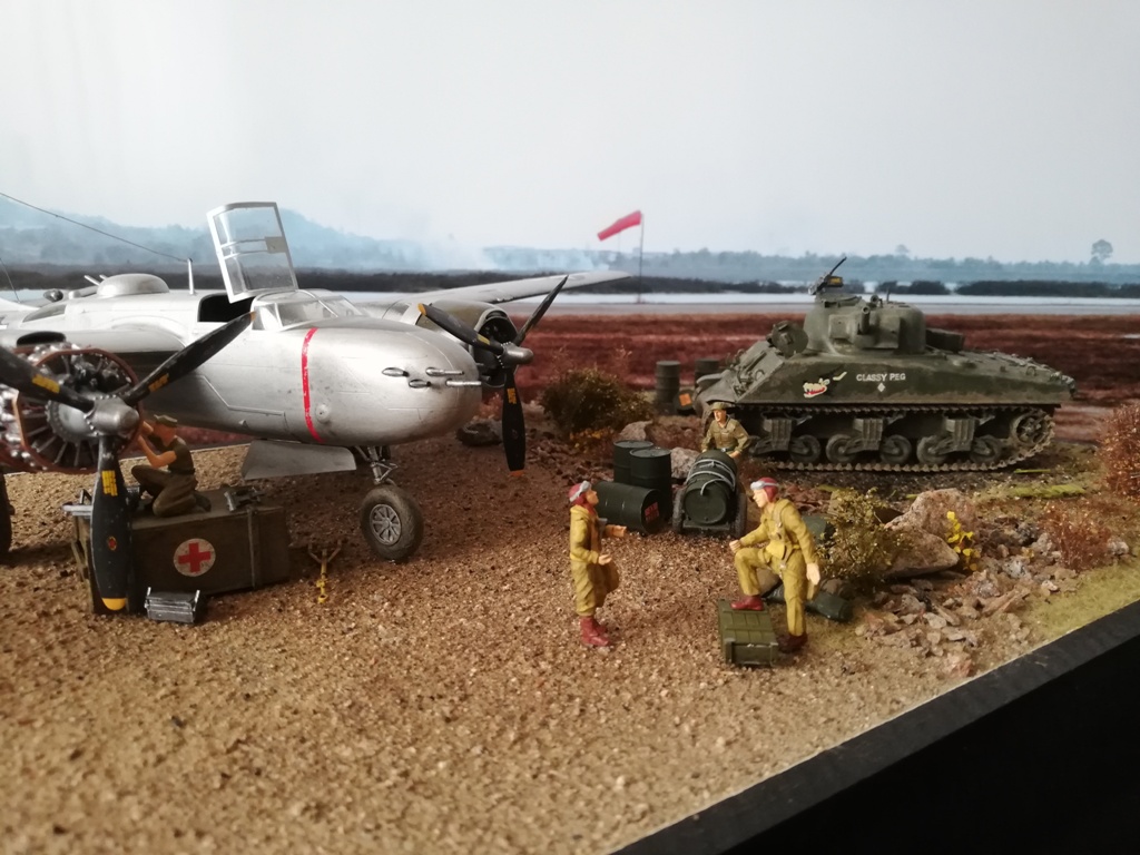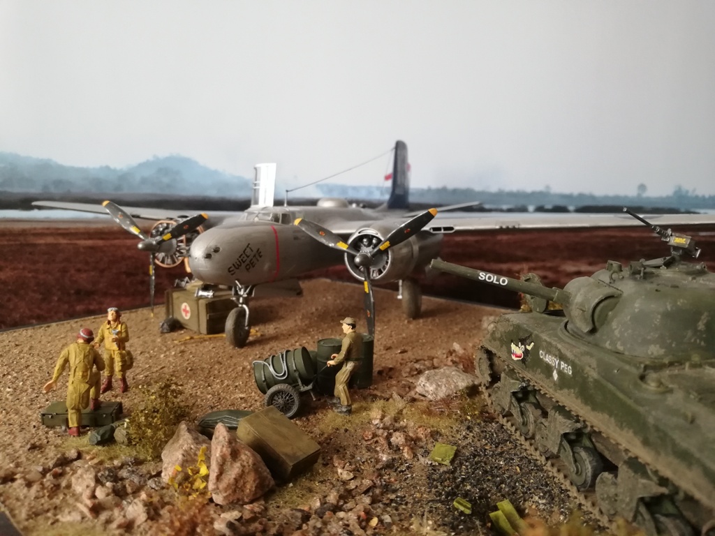 Diorama v měřítku 1:48 zachycující americký letoun Douglas A-26 Invader, při opravě motoru, stojící na letištní dráze Okinawského letiště a ikonický tank U.S. A4M3 Sherman stojící v povzdálí.