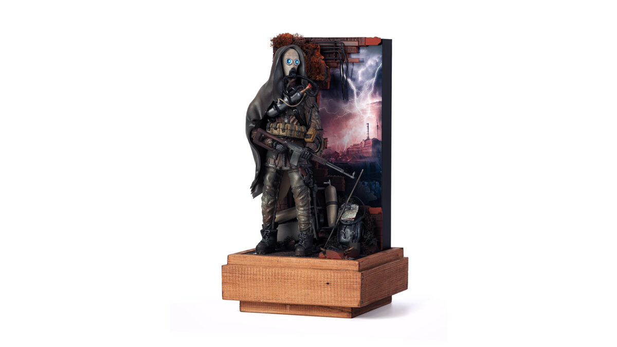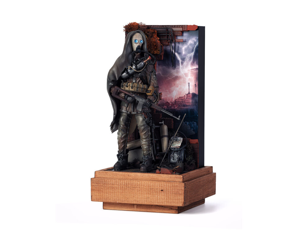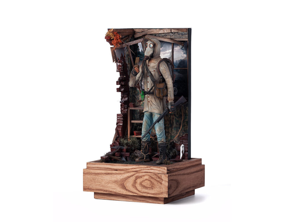 Diorama na motivy herní série S.T.A.L.K.E.R - Shadow of Chernobyl. Ručně modelovaná a barvená figurka stalkera veterána z polymerové hmoty, hledajícího vzácné artefakty a bájný Monolit plnící přání.