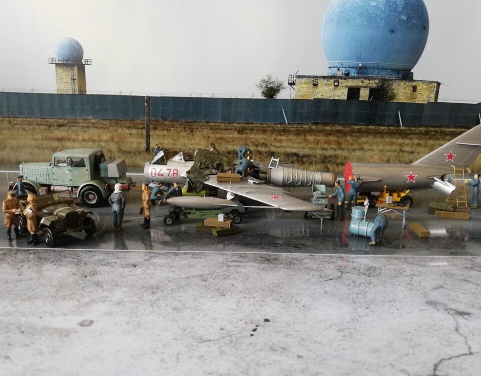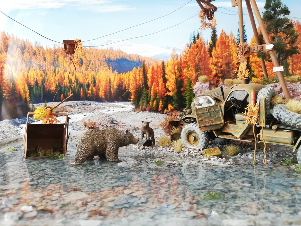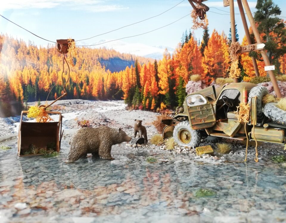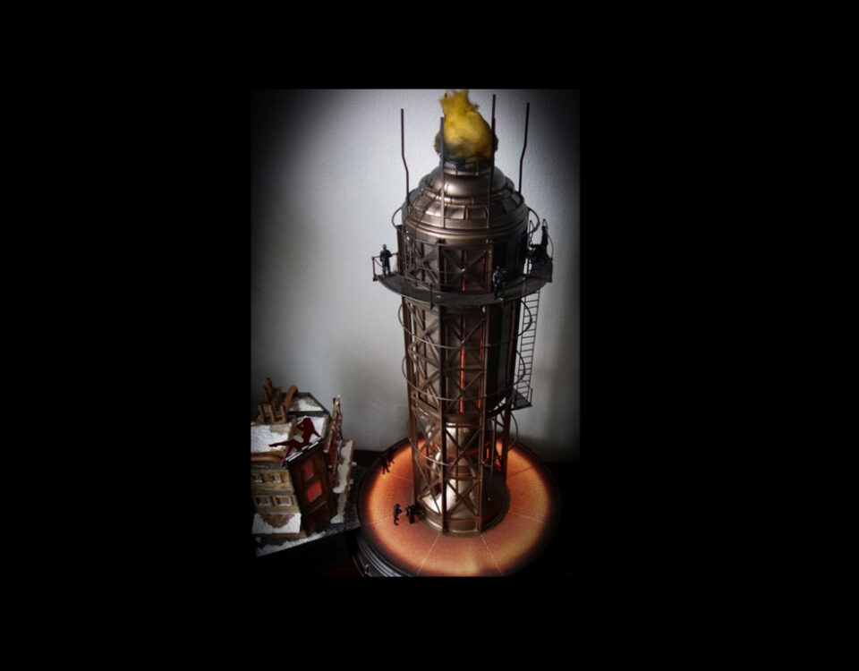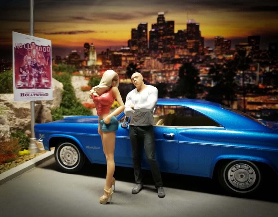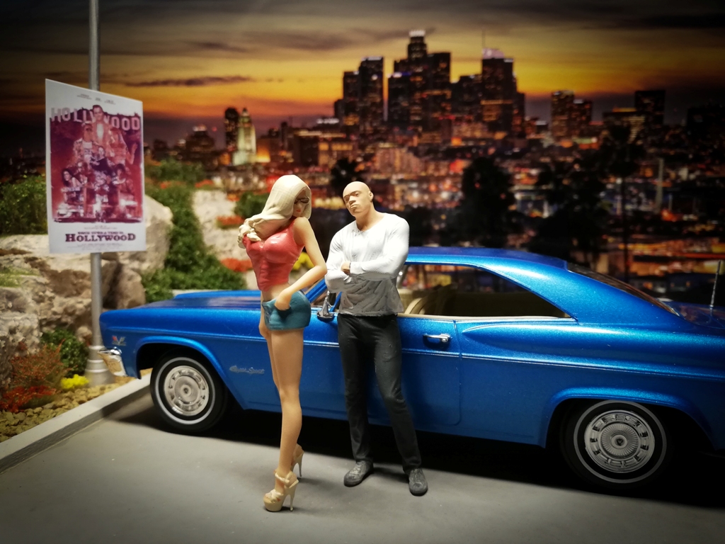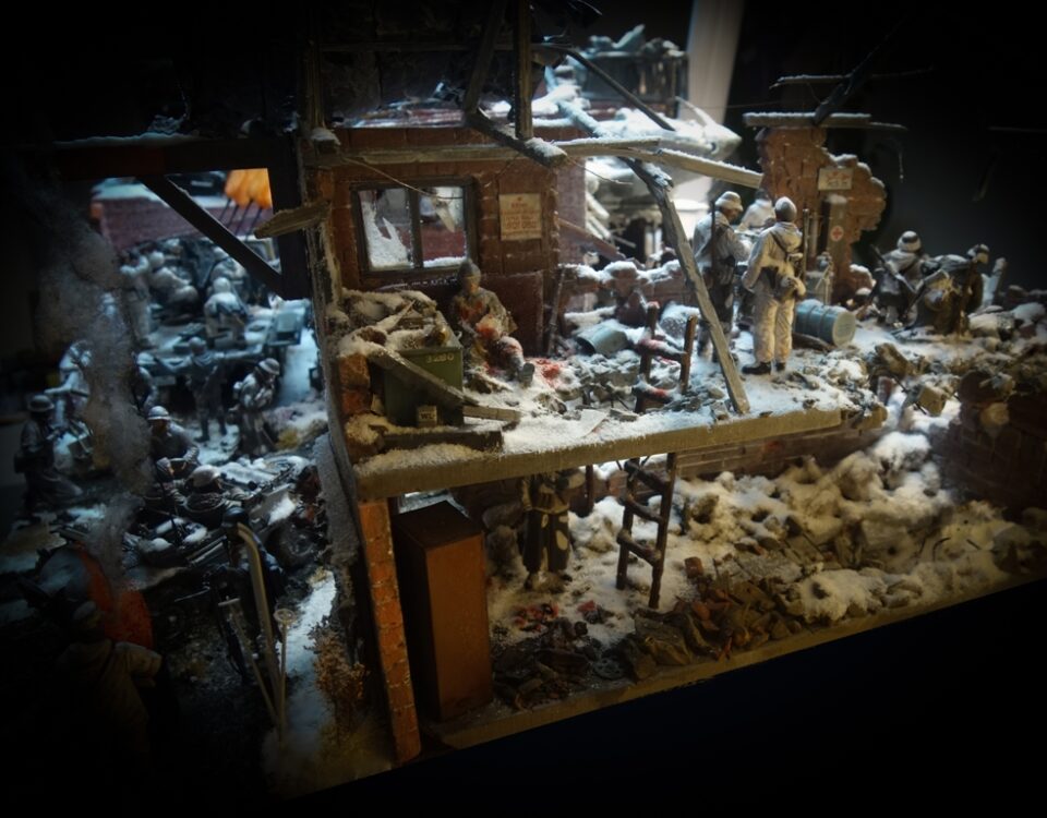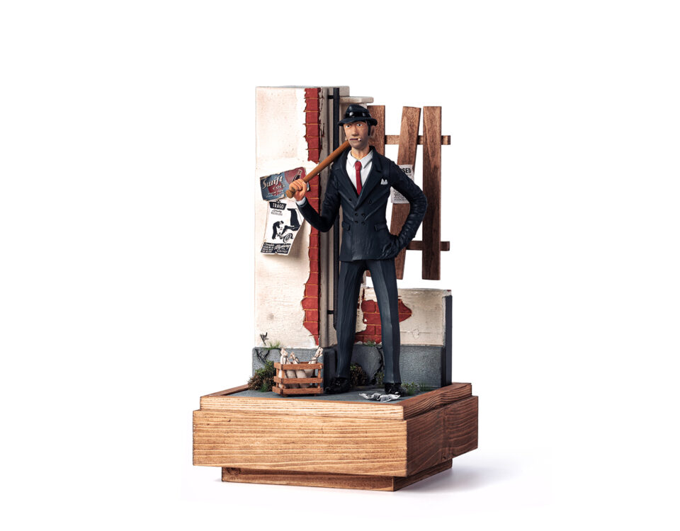 Diorama na téma herní série Mafia. Ručně modelovaná a barvená figurka klasického gangstera s baseballovou pálkou z polymerové modelovací hmoty, prodávajícího alkohol v době prohibice, zasazená do prostředí italské čtvrti třicátých let dvacátého století města Lost Heaven.