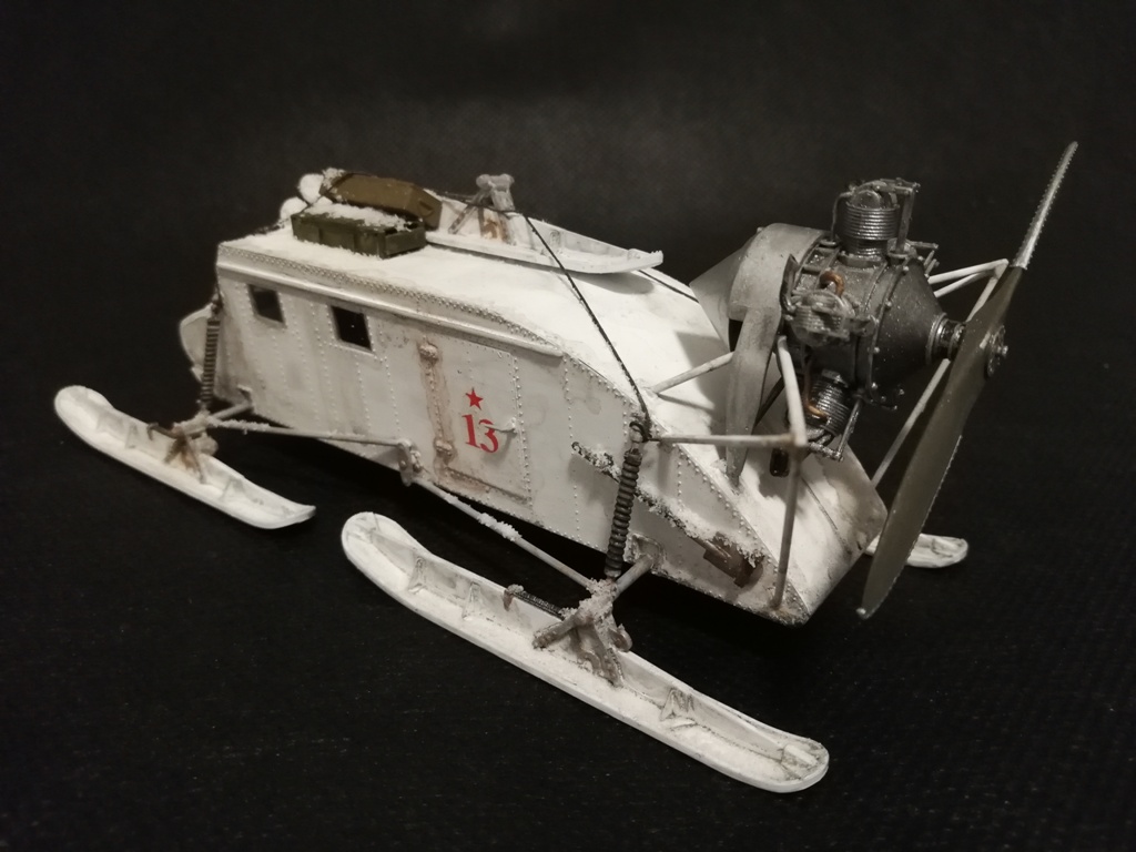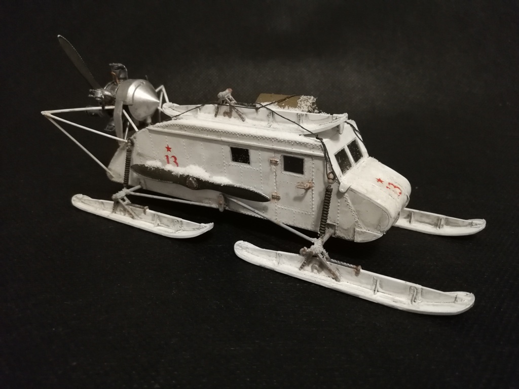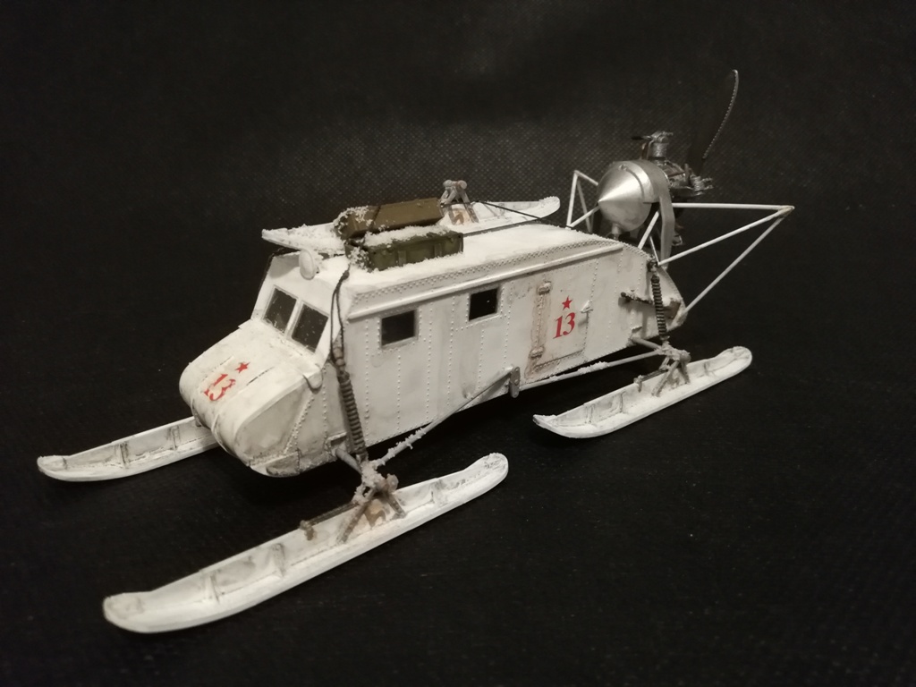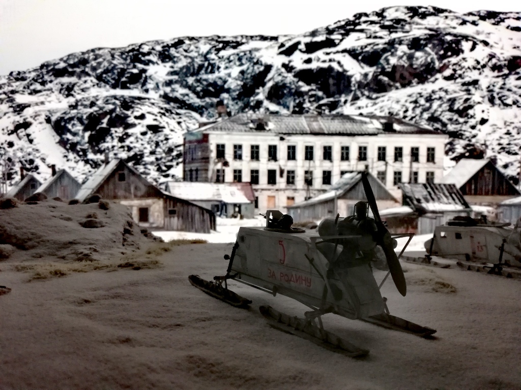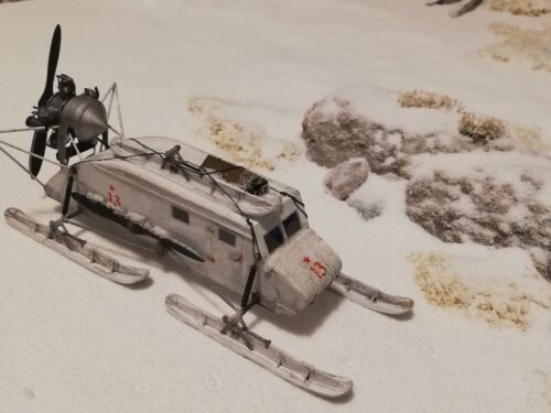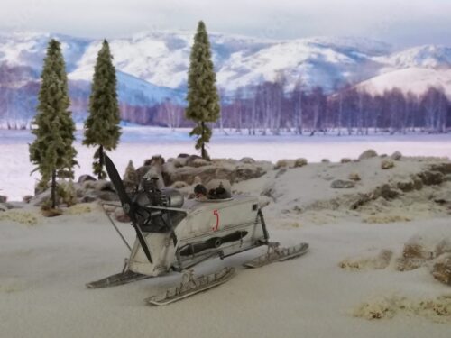 Diorama zachycující aero sáně NKL-26 a NKL-16 v měřítku 1:35, patrolující zasněženou krajinou.
